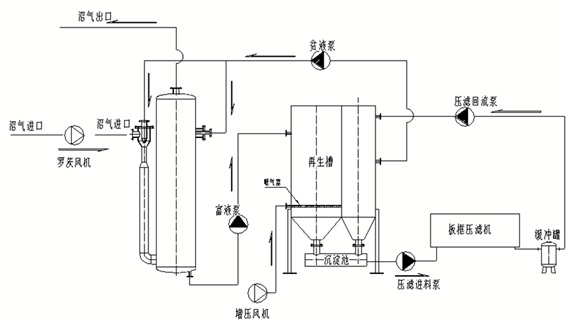湿法脱硫工艺主体包括洗涤塔、脱硫塔和再生槽、H₂S采样与监测系统、碱液配置槽、供水软水装置、液位控制系统、支撑件和连接件等,脱硫系统通过对出气H₂S浓度的监控以及碱度催化剂浓度和反应温度的操作监控,实现对沼气中H₂S脱除。